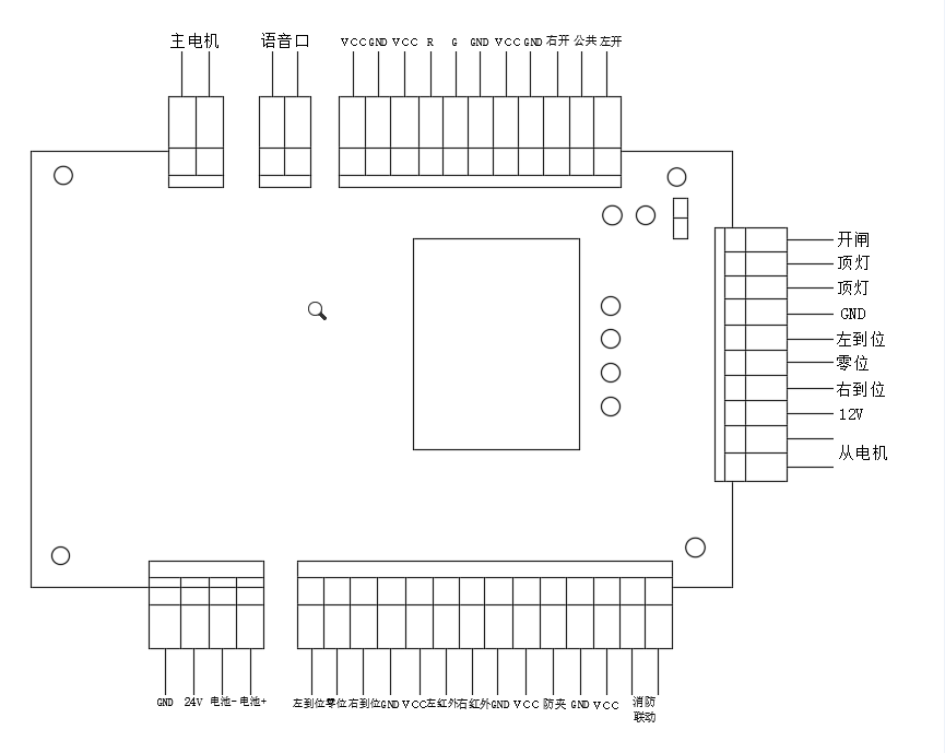 开闸 顶灯 顶灯 GND 左到位 零位 右到位 12V 从单机 |