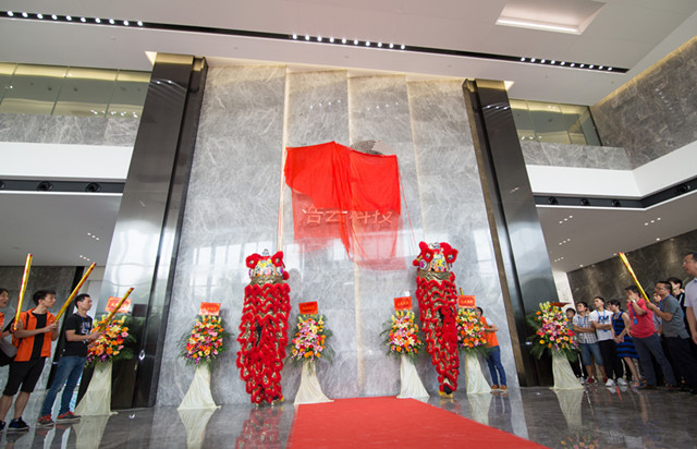 在雷总致辞后,公司众高管及特殊嘉宾叶立文先生(园区副总)登台出席隆重的剪彩仪式,随后由瑞狮迎入浩云大厦大堂,一起参加了揭牌仪式。在众同事的一片期待目光下,掀开了盖在大堂正中的浩云科技LOGO的红盖头。